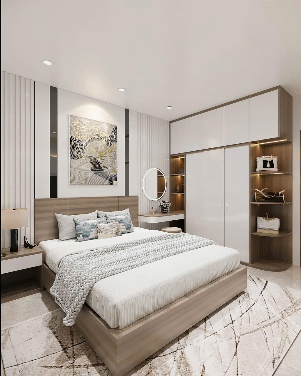 Bộ sản phẩm bao gồm: giường ngủ chắc chắn, tủ quần áo kịch trần bo góc tích hợp đèn LED, và bàn trang điểm/làm việc treo tường thông minh.