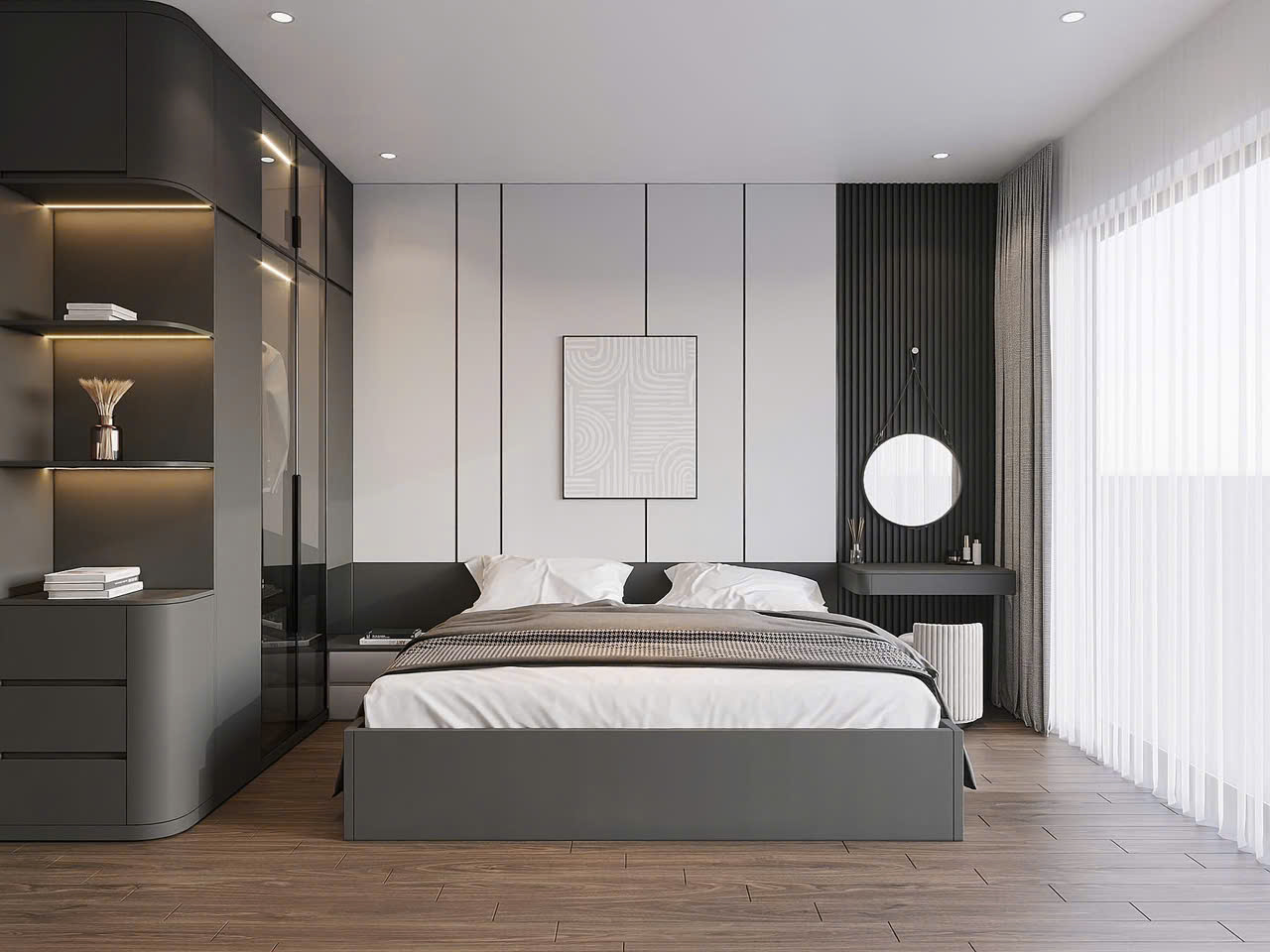 Vách ốp đầu giường: Sự pha trộn giữa mảng phẳng trắng tối giản và các đường line đen tạo sự tương phản mạnh mẽ, hiện đại.