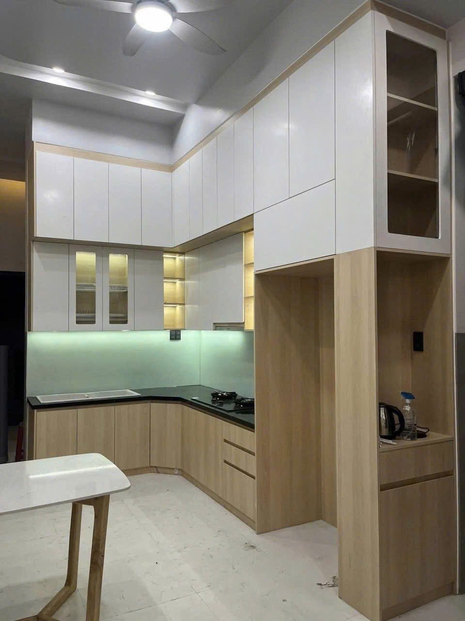 Combo tủ bếp chữ L gỗ công nghiệp phối trắng có tủ trang trí và đèn LED