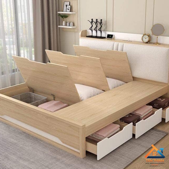 Có 3 ngăn kéo bên trái hông giường và 3 ngăn cánh lật thông minh ở bụng giường bên phải.