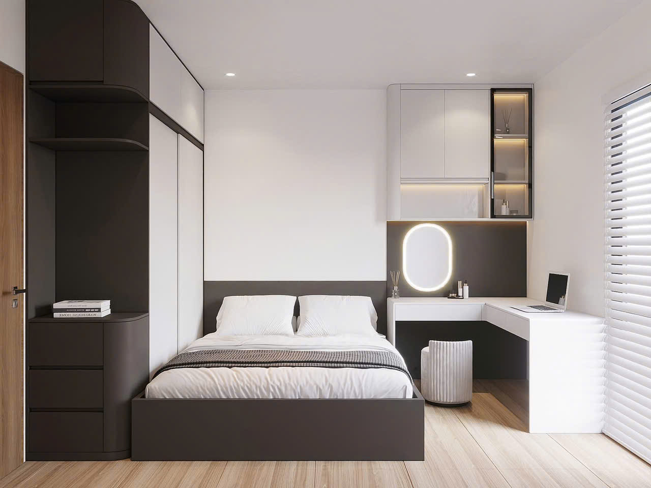 Phối màu tương phản: Sự kết hợp giữa mảng tối (thân tủ, giường) và mảng sáng (cánh tủ, mặt bàn) giúp căn phòng có chiều sâu và luôn trông sạch sẽ, hiện đại.