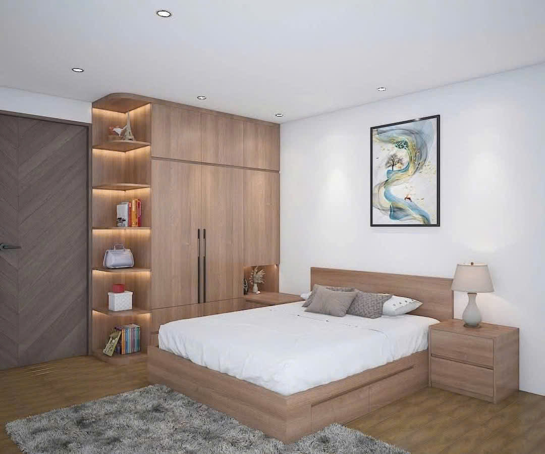 Thiết kế tinh tế: Sự phối hợp màu sắc trung tính (Gỗ Oak - Trắng) giúp căn phòng trông rộng rãi và sáng sủa hơn.
